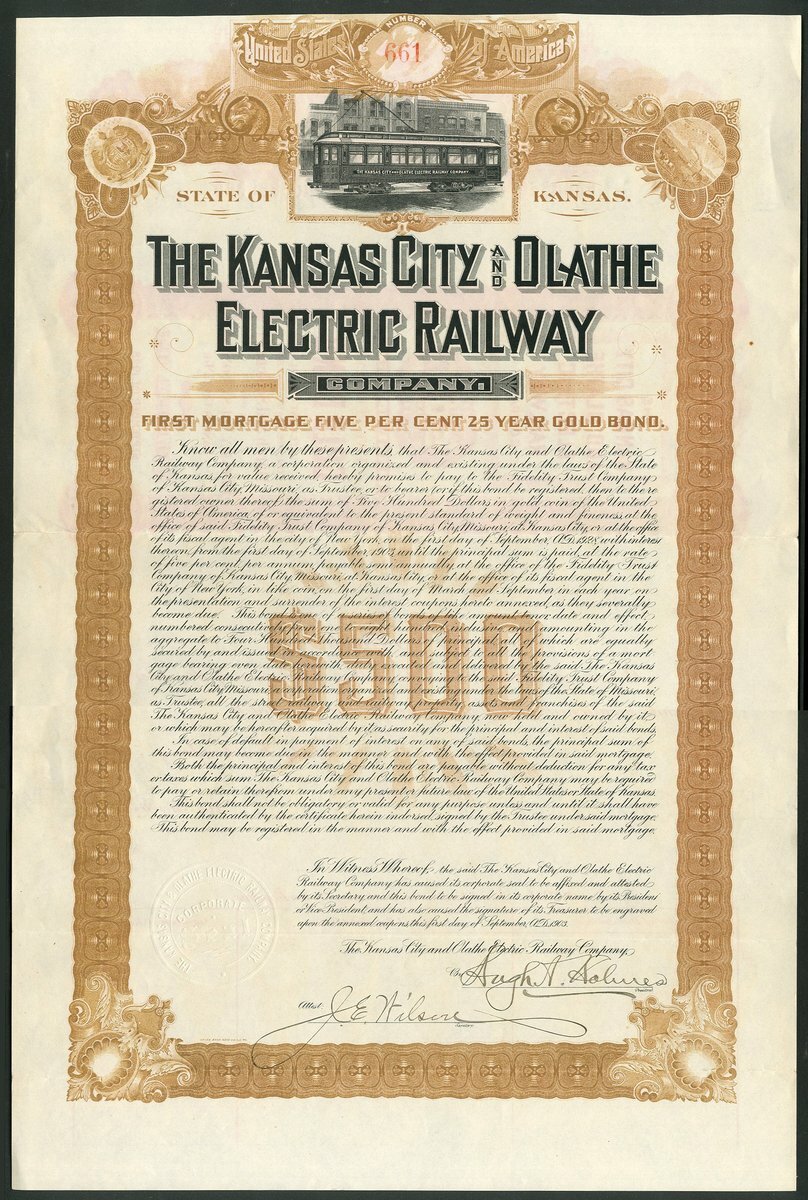 U.S.A.: Kansas City and Olathe Electric Railway Company, First Mortgage 5% 25-Year Gold Bond, $500, 1903, #661, large format piece with vignette of electric tramcar at top, orange-brown and black, with coupons, NOT cancelled. GVF.