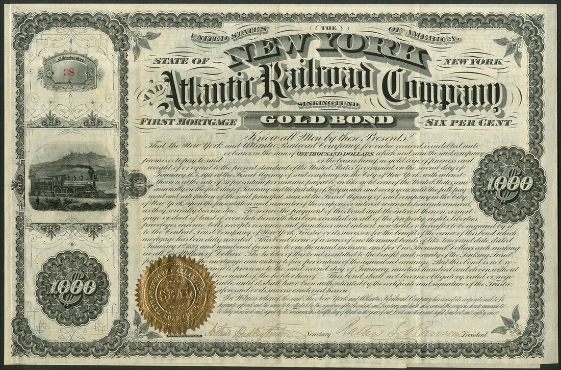 U.S.A.: New York and Atlantic Railroad Company, First Mortgage 6% Gold Bond, 1881, $1000, #38, steam train at left, black, gold seal, with coupons, not cancelled. GVF.