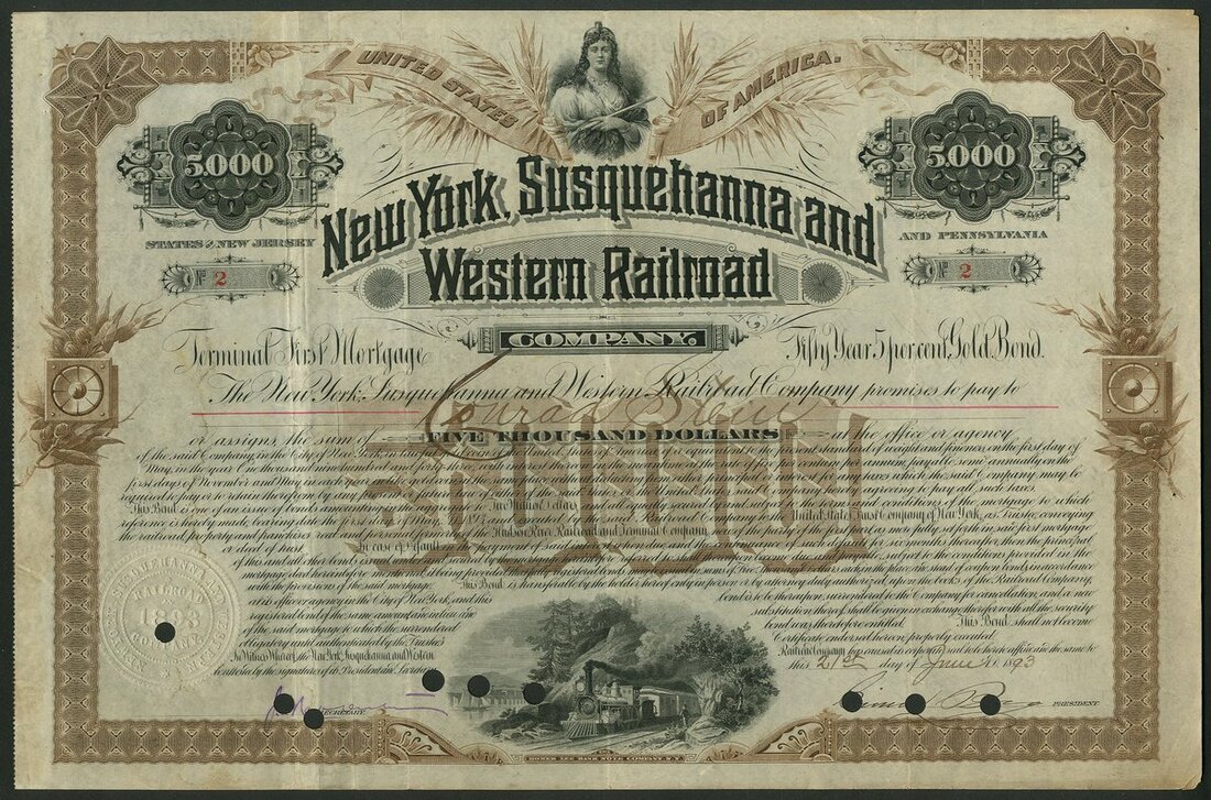 U.S.A.: New York, Susquehanna and Western Railroad Co., Terminal 1st Mortgage 50-Year 5% Gold Bond, $5,000, 18[93], #2, steam train at bottom emerging from tunnel, brown and black, hole cancelled. VF. NO RESERVE