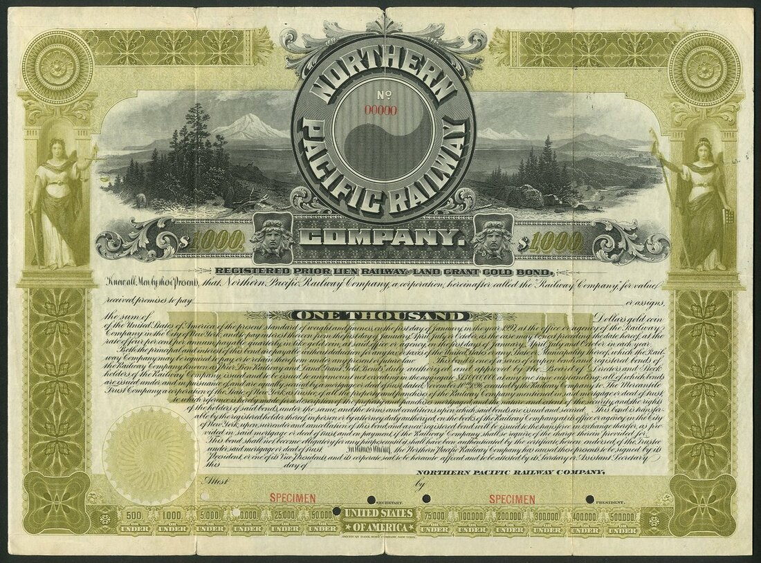 U.S.A: Northern Pacific Railway Co., Registered Prior Lien Railway and Land Grant Gold Bond, 1896, Specimen $1000, large landscape at top behind title, ornate border, olive green and black. Torn and repaired on folds, F-VF.