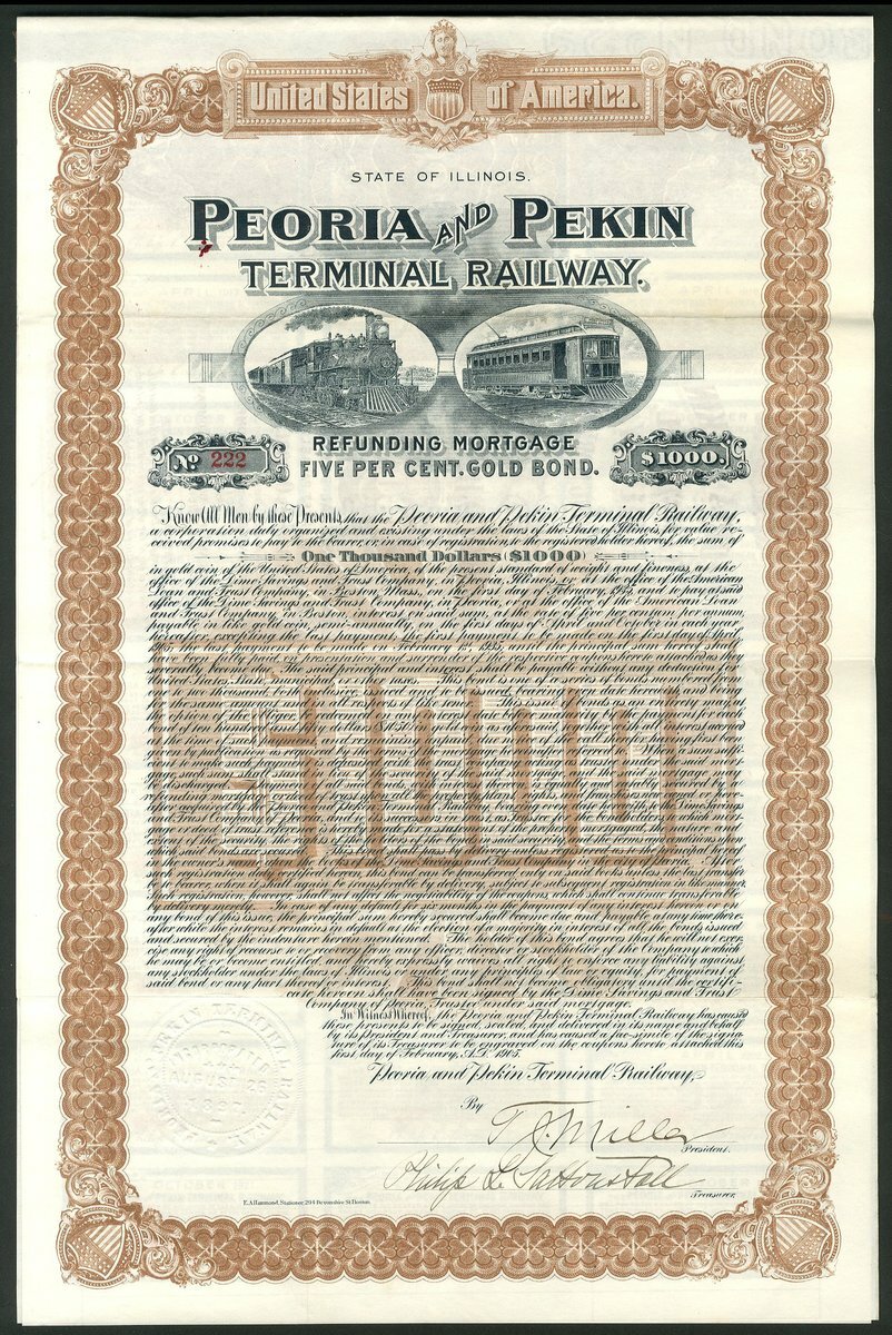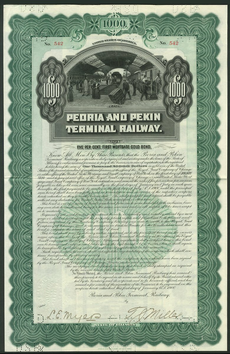 U.S.A.: Peoria and Pekin Terminal Railway, 5% First Mortgage Gold Bond, 1900, $1000, #542, lovely vignette of busy station interior, green, with coupons, cancelled, together with 5% Refunding Mortgage Gold Bond, $1000, 1905, #222, steam train and electric car, brown, with coupons, NOT cancelled. Both GVF (2).