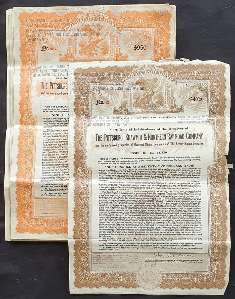 U.S.A.: Pittsburg, Shawmut & Northern Railroad Company, a group of certificates of indebtedness of the receiver, 6%, 1929, $475, 1 example, brown and $950, orange, 17 examples. The first with some edge damage, the others VF (18), the first not in COX.