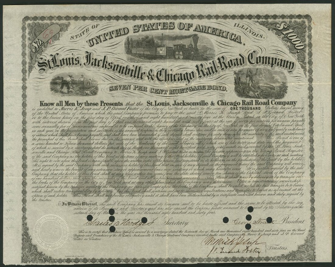 U.S.A.: St.Louis, Jacksonville & Chicago Rail-Road Company, 7% Mortgage bond for $1000, 1864, #69, signed by Morris K. Jesup as trustee, steam train at top, black, grey underprint '1000', hole cancelled, no coupons remain. Jesup, 1830 - 1908, was a banker, financier and philanthropist, retiring from business in 1884. He was a president of the American Museum of Natural History and also of the New York Chamber of Commerce from 1899 until 1907. VF and scarce.
