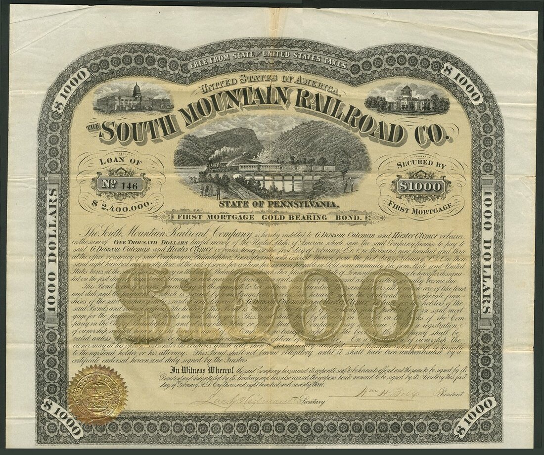 U.S.A.: South Mountain Railroad Co., (PA), First Mortgage gold bond, $1000, 1873, #146, large and impressive piece with vignette of steam train crossing bridge, Government buildings in top corners, black, buff underprint, gold '$1000' in centre, with coupons. GVF.