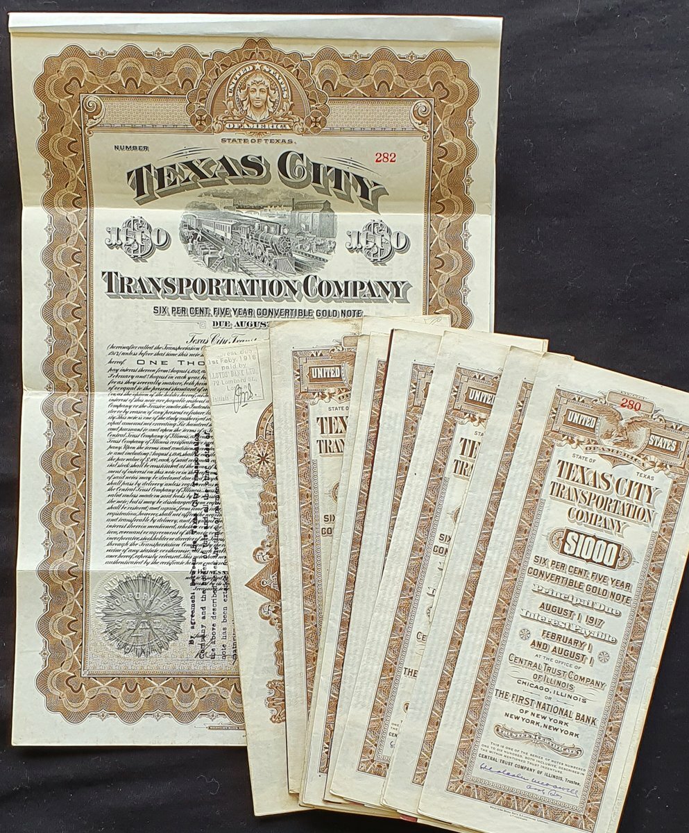 U.S.A.: Texas City transportation Company, 5-Year 6% Convertible Gold Note, 1918, a group of $1000 bonds (8), vignette at top, brown, with coupons. incorporated in 1904 toacquire the property and rights of Texas City Terminal Company. Generally VF and better (8), NOT IN COX.