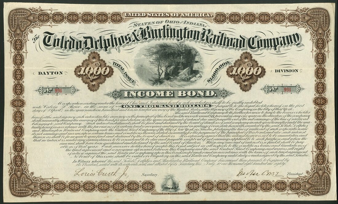 U.S.A.: Toledo, Delphos & Burlington Railroad Co., (OH, IN), Dayton Division, 6% Income Bond, $1000, #994, steam train approching from woods, brown and black. VF. NO RESERVE