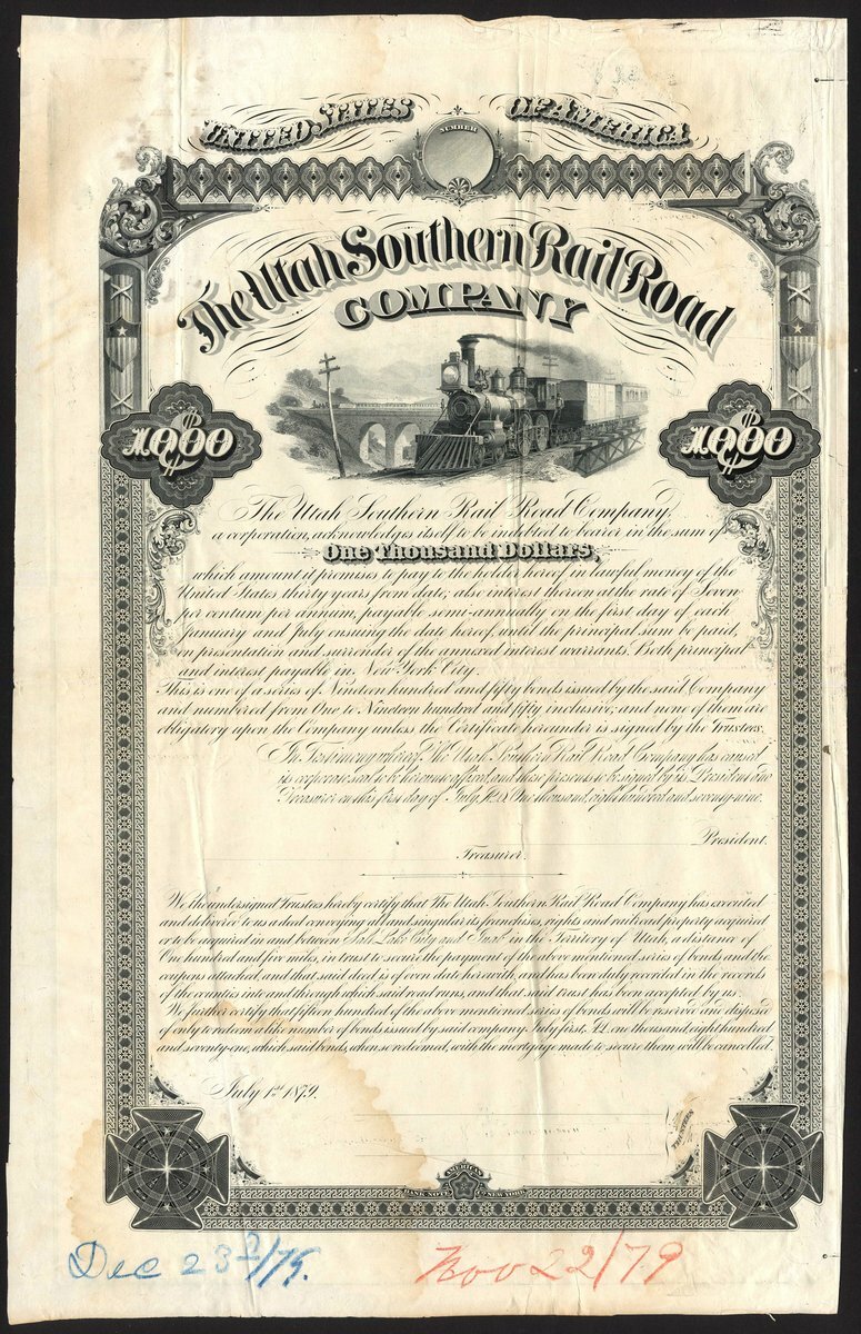 U.S.A.: Utah Southern Rail Road Co., printer's proof $1000 bond, 1879, printed by the ABNCo, steam train crossing bridge and another in background, lovely ornate border with scrollwork at corners, black on India paper, together with relevant paperwork. Not in Cox. F- VF and very rare.