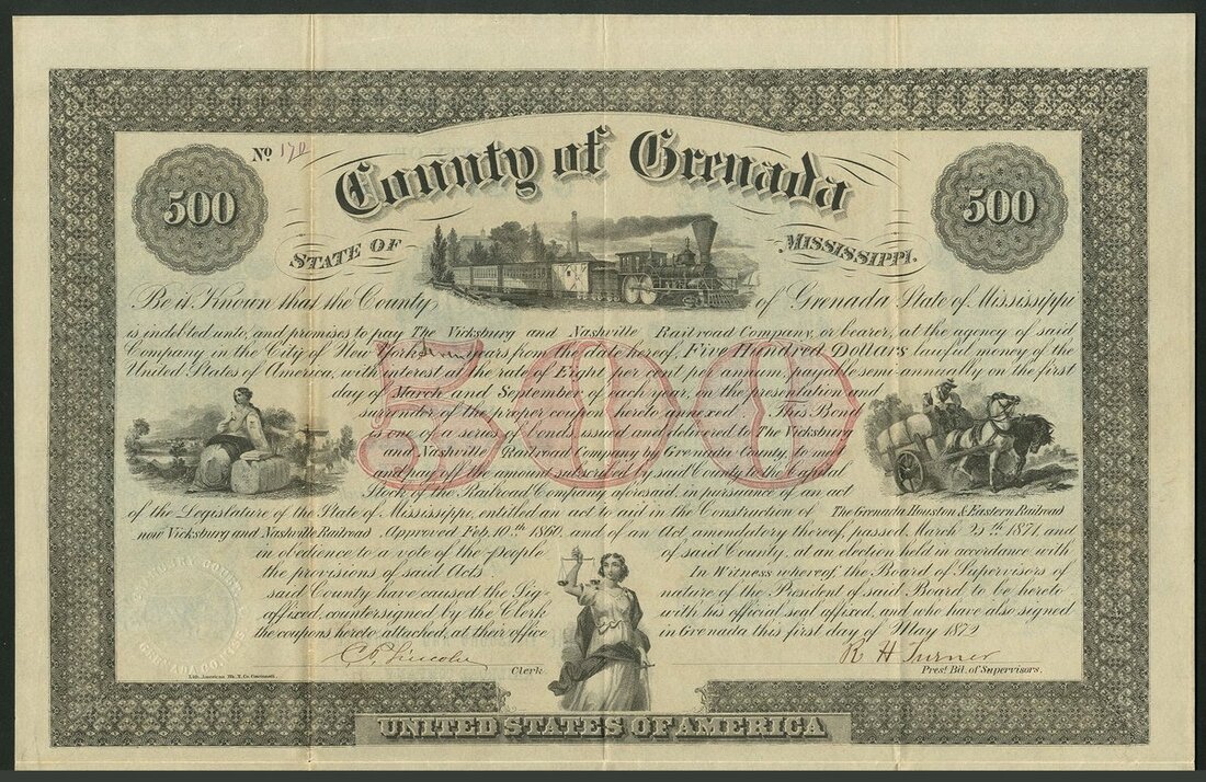 U.S.A.: Vicksburg and Nashville Railroad Company, 8% bond for $500 of the County of Granada, Mississippi, 1872, #170, in aid of the company, steam train at top, black, red underprint, with coupons. GVF and rare.