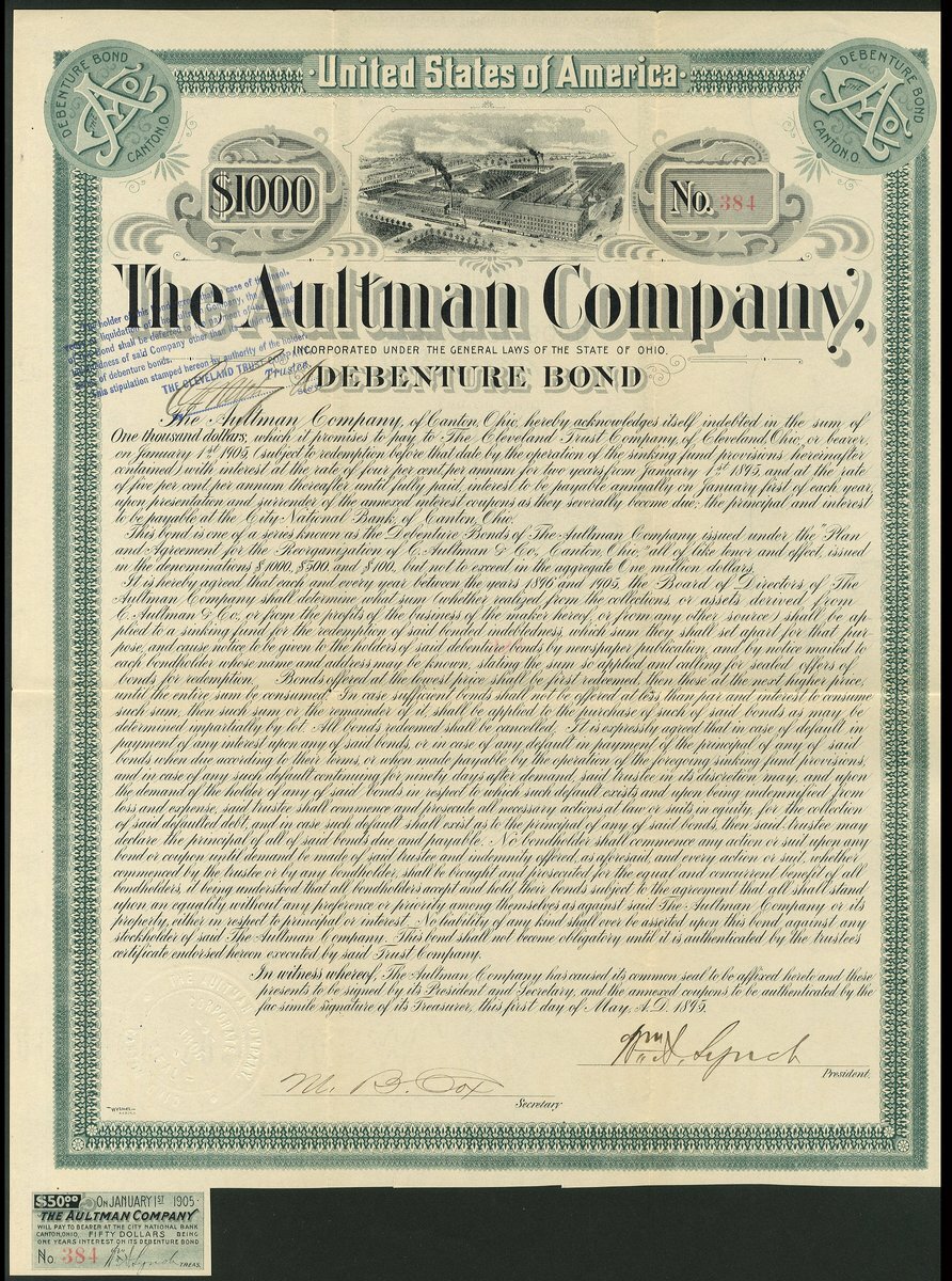 U.S.A: Aultman Company, Ohio, debenture bond for $1000, 1895, #384, vignette of factory at top, green and black, one coupon remains. Formed in 1895 at Canton, Ohio, to build traction engines. By 1901 was producing steam motor cars and continued until forced into bankruptcy in 1905. GVF.