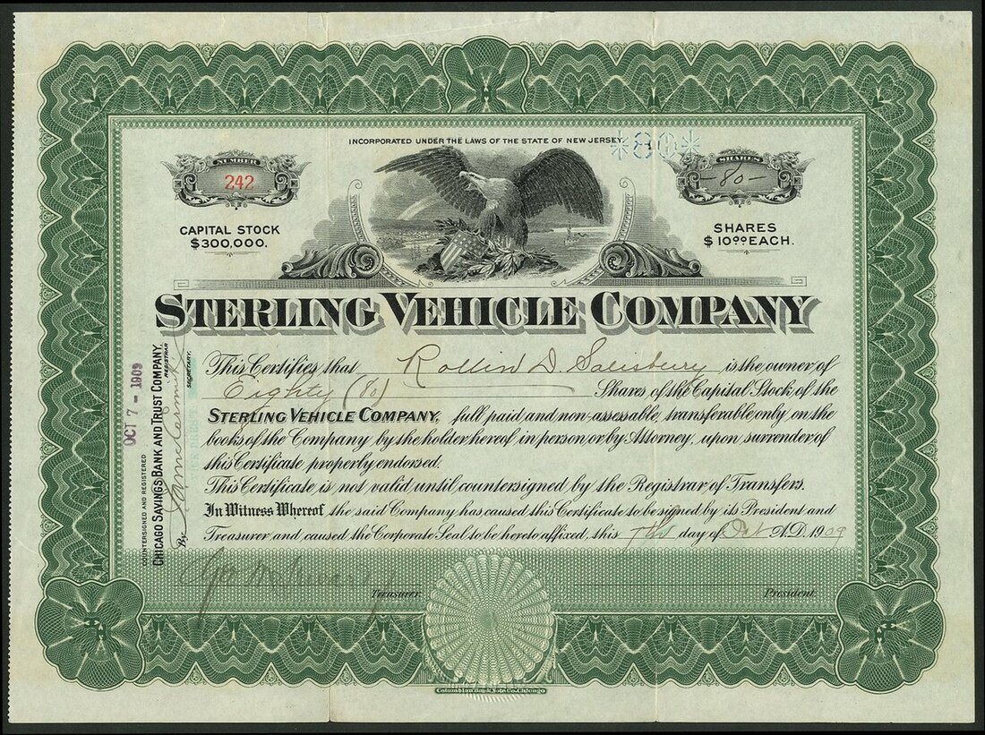U.S.A: Sterling Vehicle Company, New Jersey, $10 shares, 19[09], #242, eagle at top, green and black. Although fully issued the signature of the President appears to be missing. The company was incorporated in 1908 and was advertising a 1 ton motor truck for sale from its works in Harvey, Illinois. In receivership by 1911. Minor splitting at folds, VF.