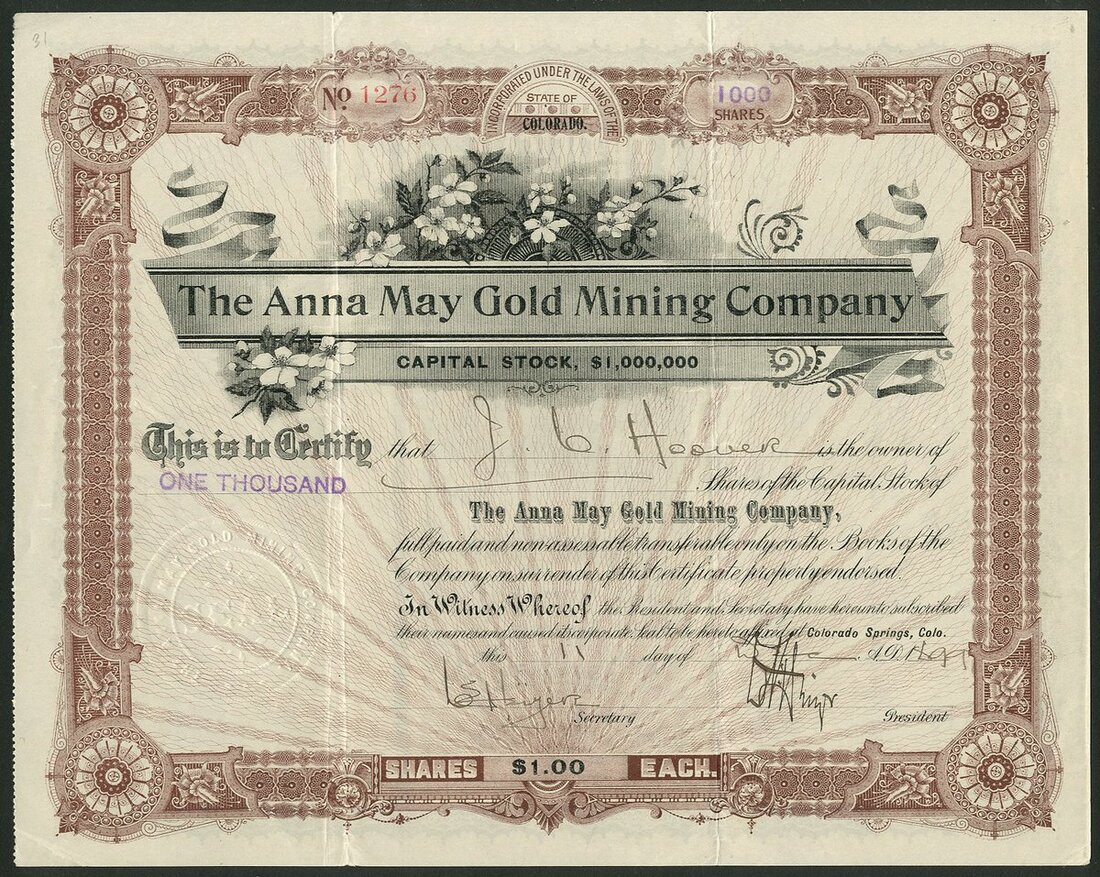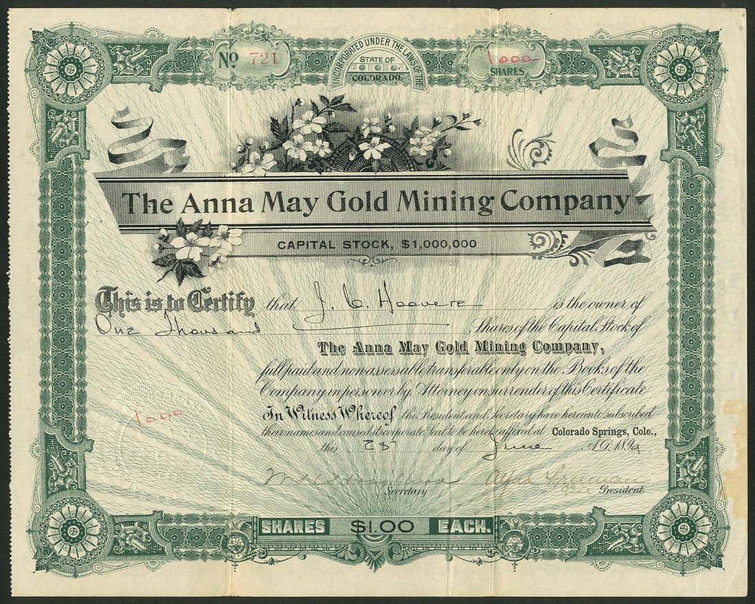U.S.A: Anna May Gold Mining Company, Colorado, pair of certificates for $1 shares, the first 189[9], #721, green and 1[899], #1276, brown, both of same design with flowers at top. Mines in the Cripple Creek Mining District. F-VF (2).