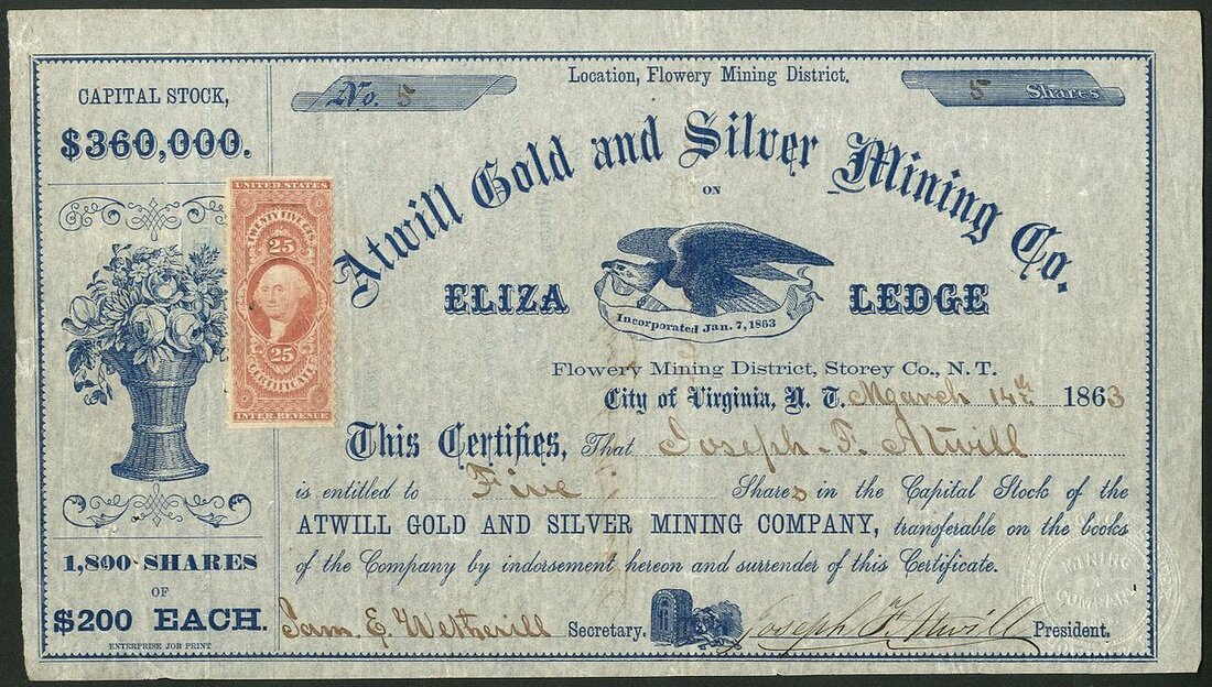 U.S.A: Atwill Gold and Silver Mining Company, Nevada Territory, $200 shares, City of Virginia 186[3], #5, eagle in centre, flowers at left, blue, adhesive revenue stamp. Flowery Mining District, Storey County, Nevada Territory. VF and rare early territorial piece.