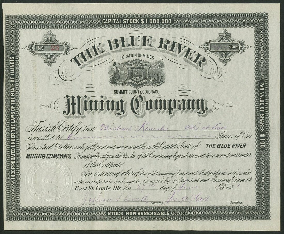 U.S.A.: Blue River Mining Company, $100 shares, East St.Louis 188[1], #23, State seal in centre, black. Mines in Summit County, Colorado. AEF.