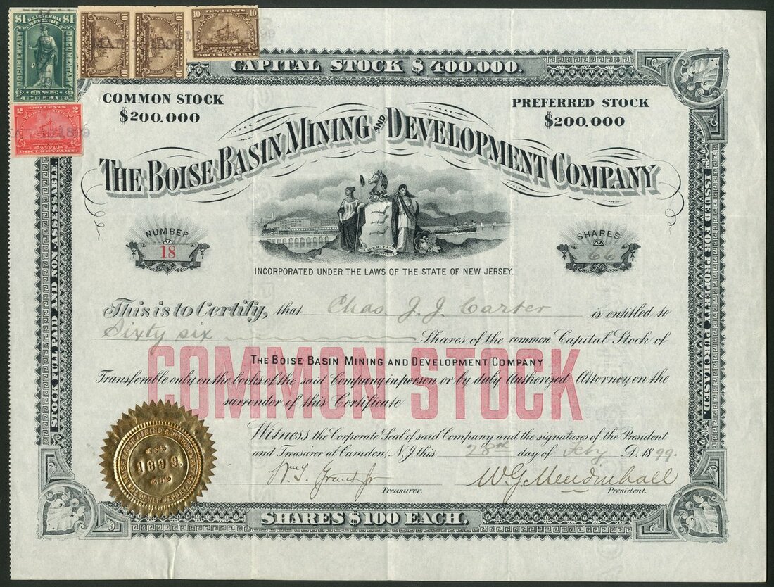 U.S.A: Boise Basin Mining and Development Co., $100 shares, 18[99], #18, female figures with shield, steam train and ship behind, ornate border, black, red underprint, gold seal. Incorporated in New Jersey to operate placer mining in Idaho, Utah, Nevada and California. GVF.