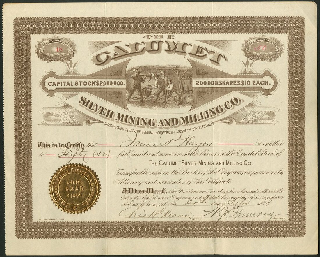 U.S.A.: Calumet Silver Mining & Milling Co. (IL), $10 shares, East St.Louis 188[8], #48, miners underground, brown, gold seal. Small tear bottom edge, GVF.