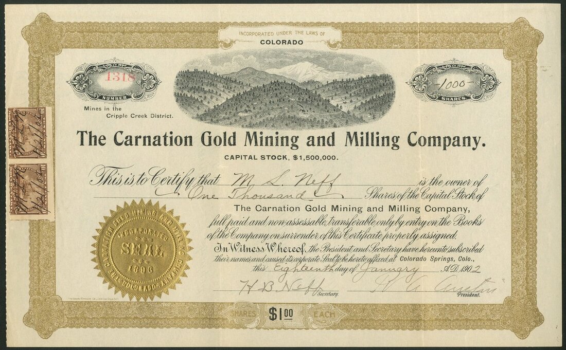U.S.A.: Carnation Gold Mining and Milling Company (CO), $1 shares, Colorado Springs 190[2], #1318, hillside with several mines, gold and black, adhesive revenue stamps. Owned the H. M Langley, H. M. Langley No. 1 on Tenderfoot Hill and the El Paso, Golden Eagle and Colorado in the Southern Cripple Creek District. AEF.