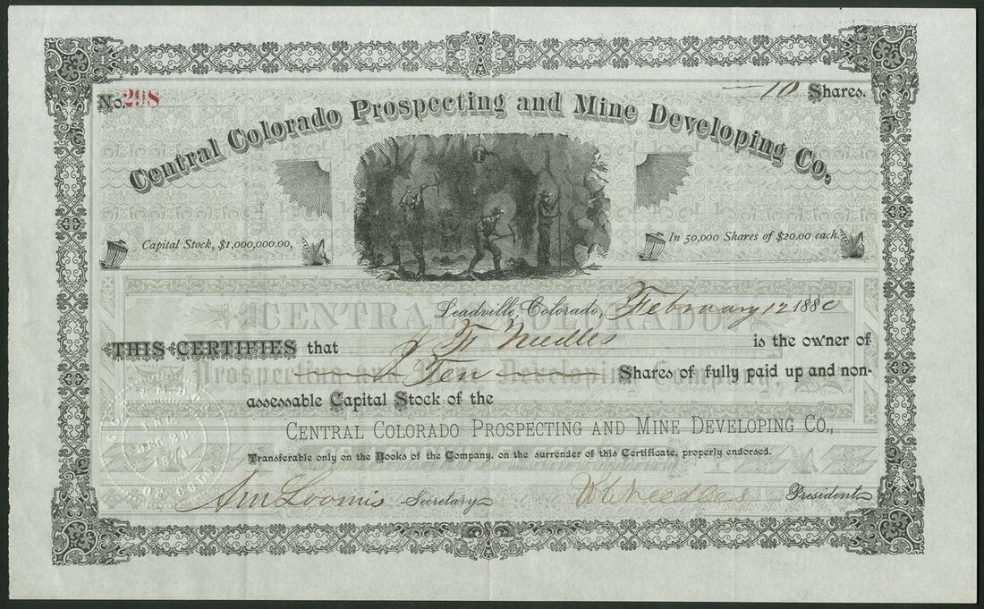 U.S.A.: Central Colorado Prospecting and Mine Developing Company (CO), $20 shares, Leadville 188[0], #298, miners at work underground, black with grey underprint. GVF.