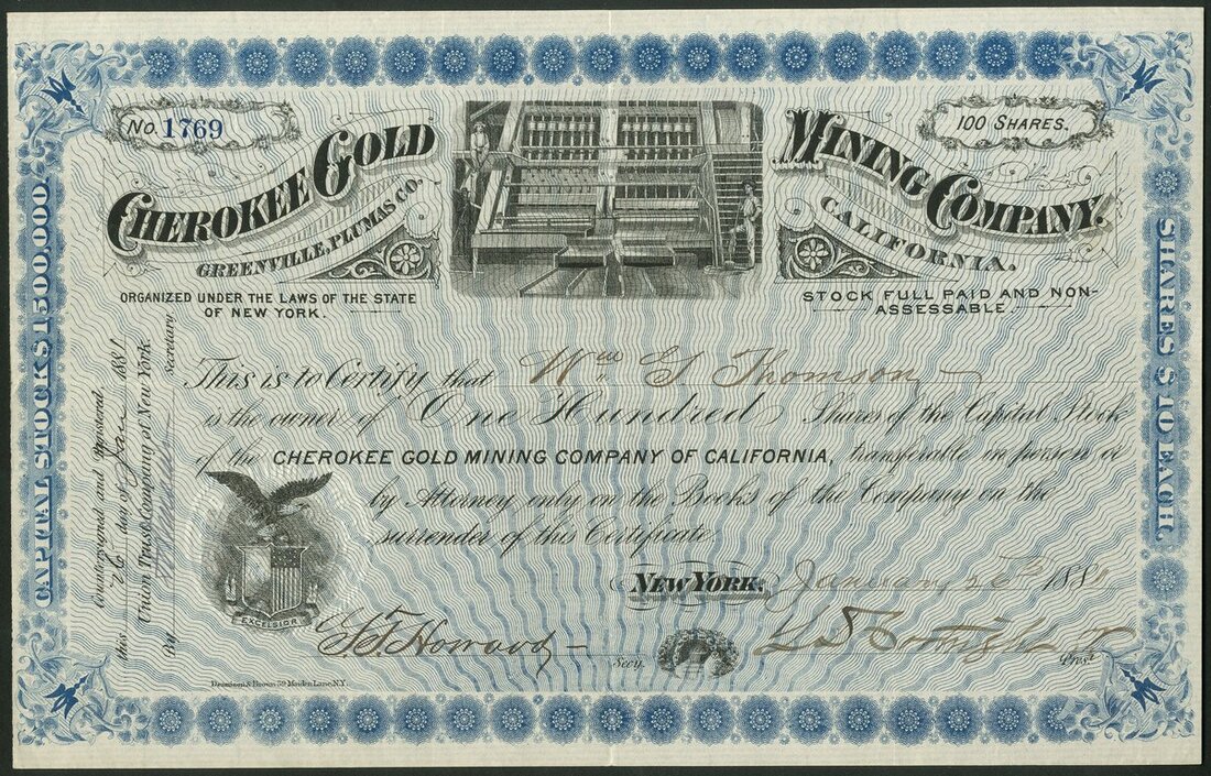 U.S.A.: Cherokee Gold Mining Company (NY), 100 shares of $10, 188[1], #1769, attractive vignette of milling machinery, blue and black. Mines at Greenville, Plumas County, California. EF.
