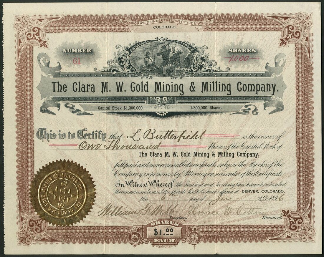 U.S.A.: Clara M.W. Gold Mining & Milling Company (CO), $1 shares, Denver 189[6], #61, miners at work top centre, brown and black, gold seal. GVF.