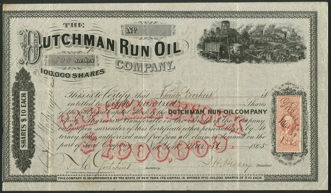 U.S.A.: Dutchman Run Oil Company (NY), $10 shares, 186[5], #66, vignette of derricks, storage tanks and wagons, black, red underprint of capital. A New York corporation owning wells along Dutchman Run, a watercourse north of Pittsburgh. AVF. NO RESERVE
