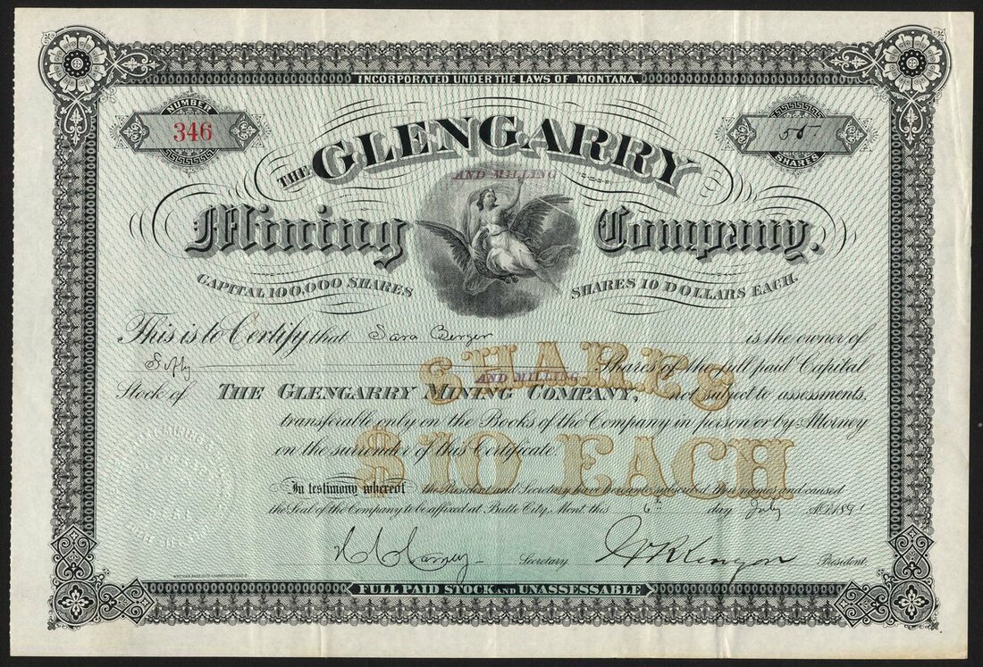 U.S.A.: Glengarry Mining and Milling Company (MT), $10 shares, Butte City 18[91], #346, allegorical figure in centre, black with blue and gold underprint. GVF.