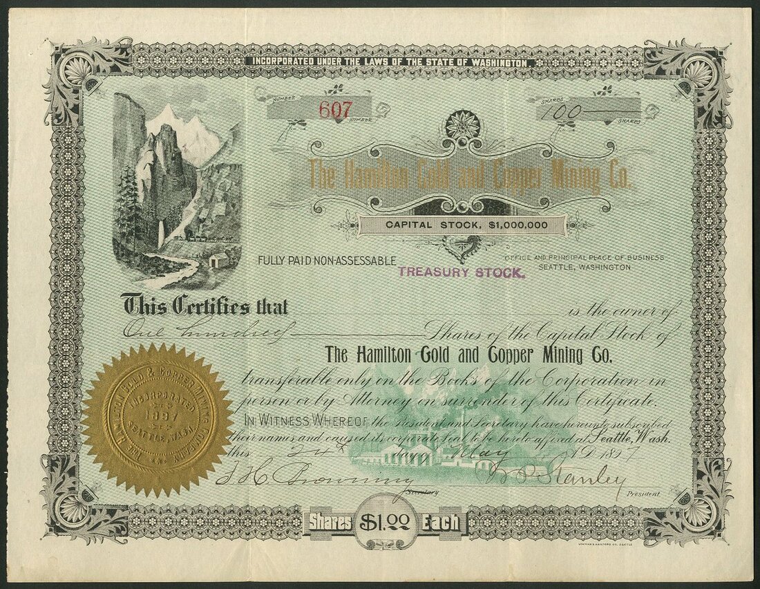 U.S.A: Hamilton Gold and Copper Mining Co. Washington, $1 shares, 189[7], #607, mountain side mine site top left, ornate border, black with green underprint, smelter in underprint. Owned 5 claims along the Skagit River, near the Town of Hamilton. Tri folds, GVF.