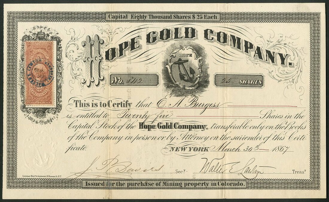 U.S.A: Hope Gold Co., Colorado, $25 shares, 186[7], #842, decorative black printing, revenue stamp. Owned 2,200 feet on the Gold Dirt Lode by Gamble Gulch. Split on folds, repairs to reverse, AVF.