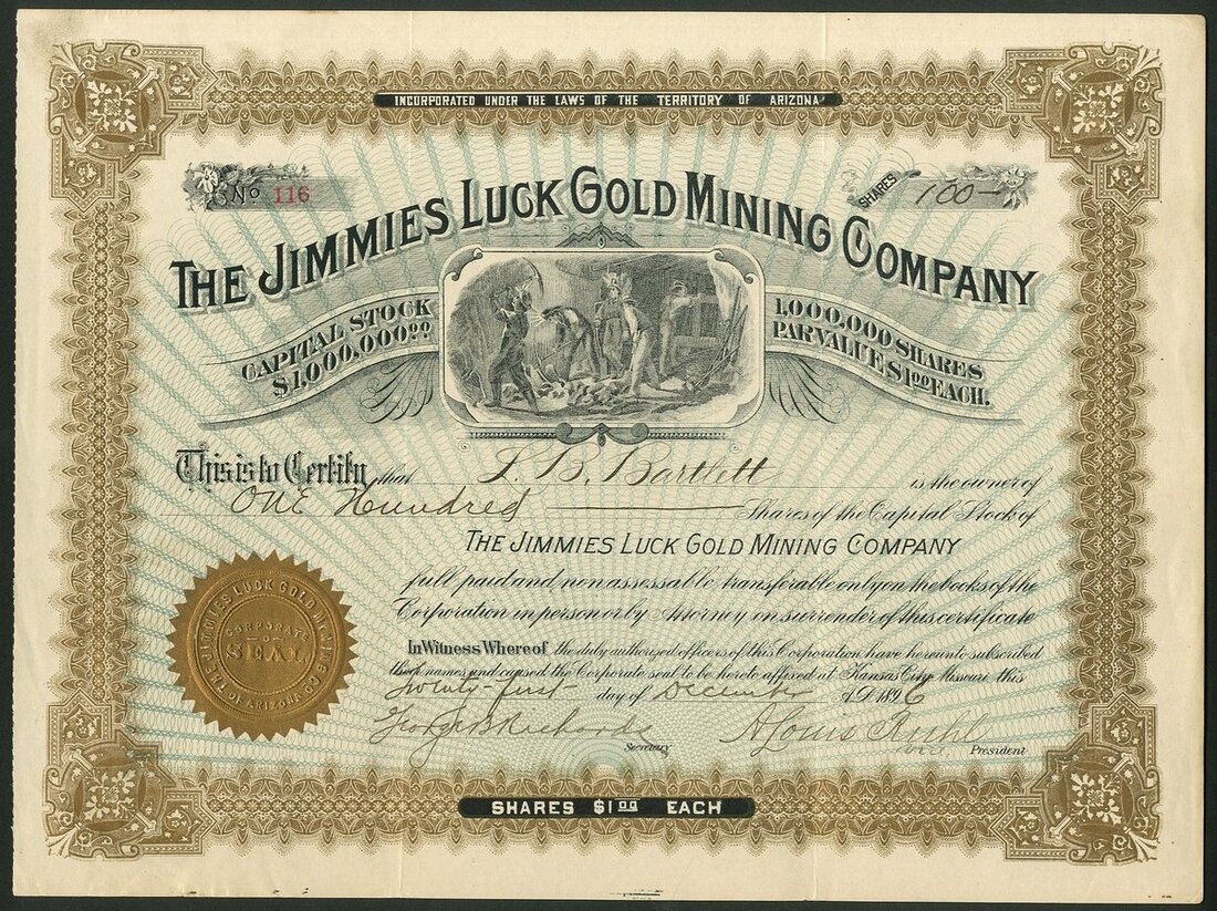 U.S.A: Jimmies Luck Gold Mining Co. Arizona, $1 shares, 189[6], #116, mine workers below title, ornate border, black and gold with blue underprint. Owned 13 claims in the Mineral Creek mining district. GVF.