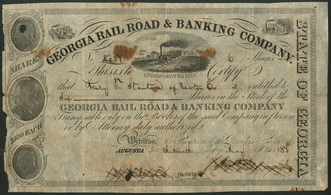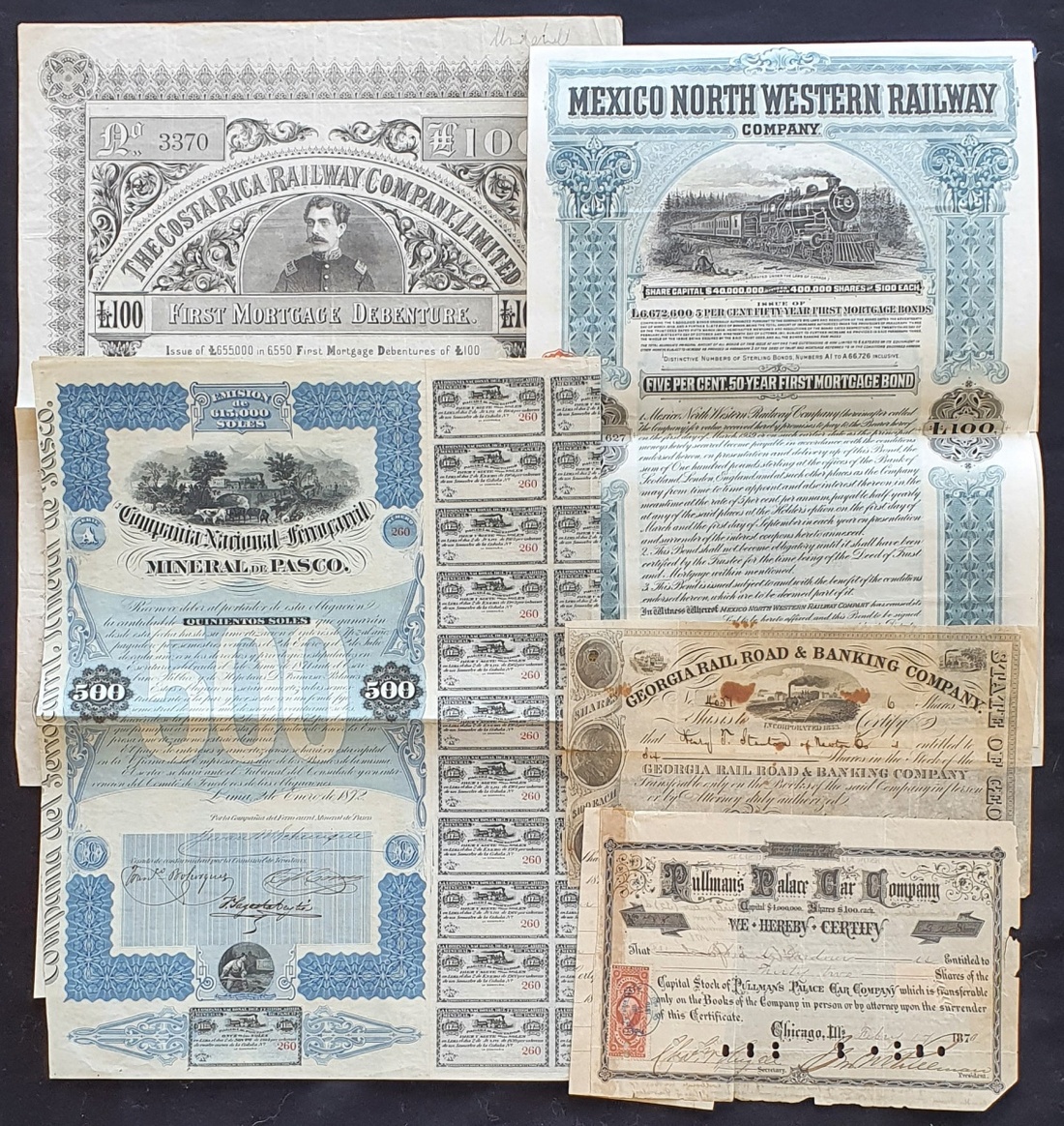 (x) A group of Railway related certificates from North and South America, comprising Pullman's Palace Car Company, 187[0]; Georgia Railroad & Banking Company, 18[56]; Ferrocarril Mineral de Pasco, 500 soles, 1872; Mexico North Western Railway Company, £100 bond, 1909, and, Costa Rica Railway Co. Ltd., 1st Mortgage debenture, £100, 188[7]. Mixed condition (see scans) (5)
