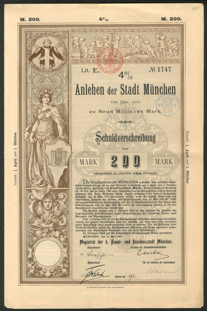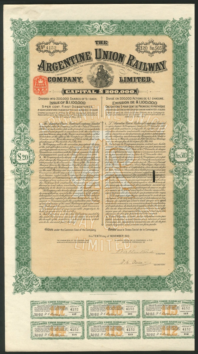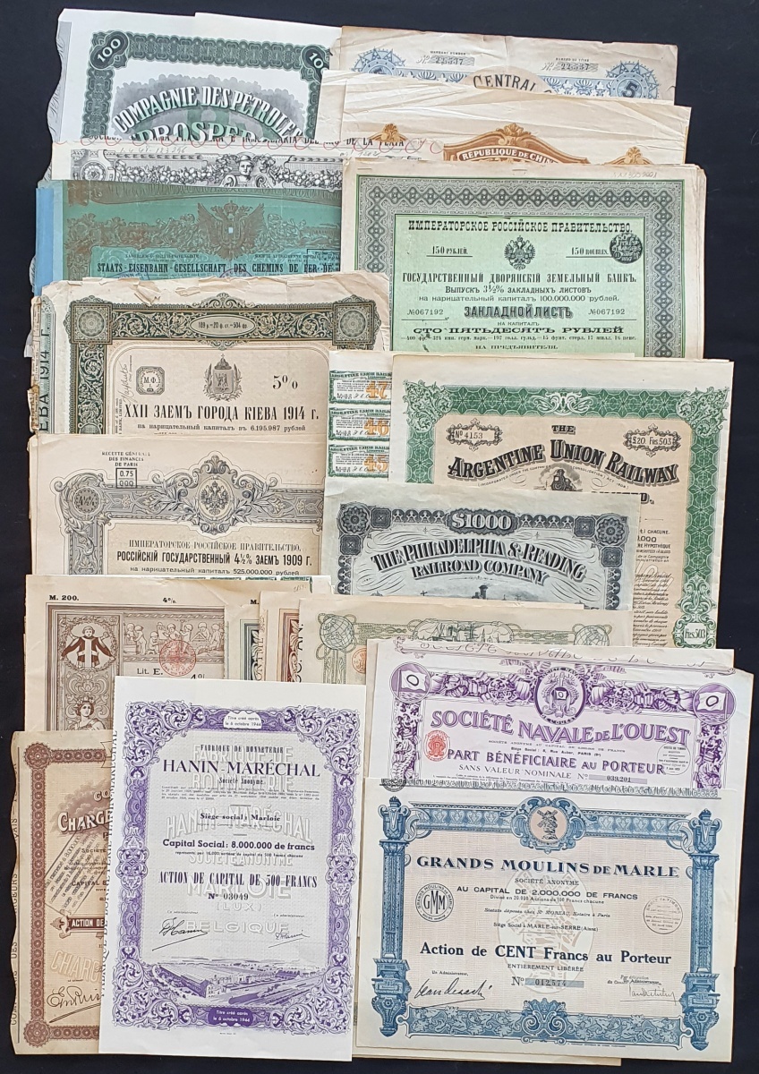 A Group of World Bonds and share, including City of Munich, 1900, 200 marks; Argentine Union Railway Co. Ltd., £20 debenture, 1910, 2 examples; Philadelphia & Reading Railroad Company, $1000, 1882; a group of 25 various Russian bonds, and, China, 1914 Industrial Loan, 500 francs, and others mainly French and Belgian (12). Mostly VF and better (42).