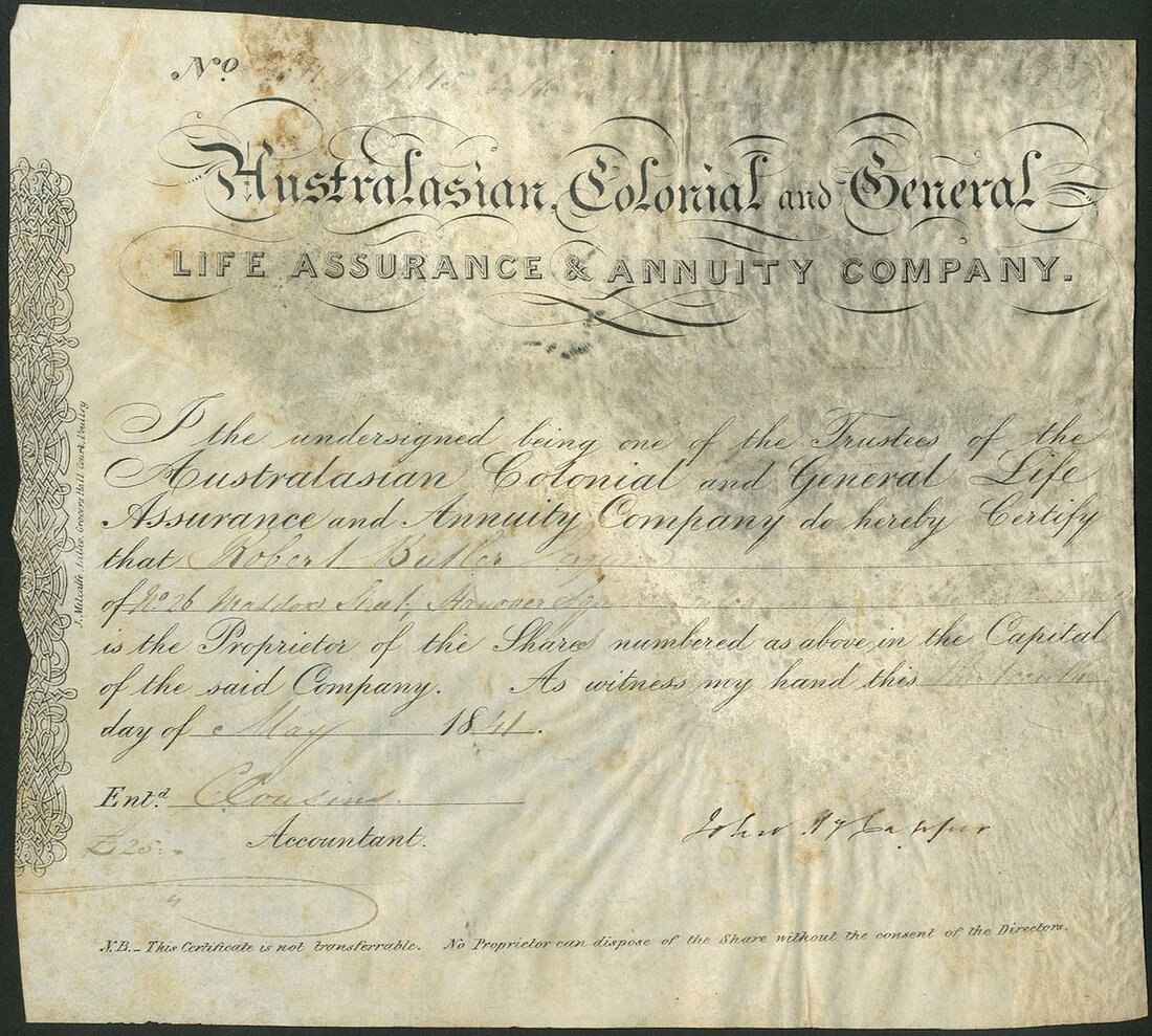 Australia: Australasian Colonial and General Life Assurance & Annuity Company, certificate of shares, #1611-15, 18[41], signed as trustee by John Henry Capper, black printing, on vellum. The company offered comprehensive insurance for those travelling and living overseas. John Henry Capper was also employed under the lengthy title of 'Superintendant of Ships and Vessels Employed for the Confinement of Offenders under Sentence of Transportation'. Some discolouration but about VF and rare. Only 2 examples known, both in similar condition.