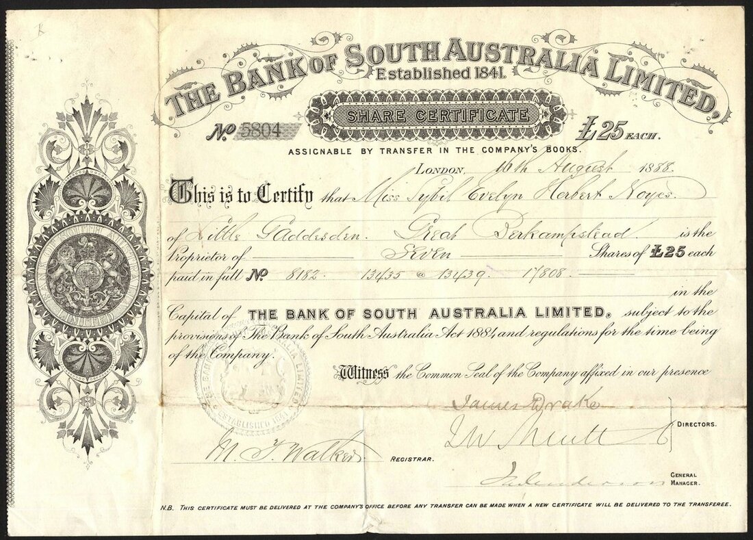 Australia: Bank of South Australia Ltd., £25 shares, 18[88], #5804, scrollwork and Royal arms at left, black. Founded in 1837 as the banking arm of the South Australian Company. Separated in 1842 and given a Royal charter in 1847 as the South Australian Banking Company. Name changed when charter renewed in 1867. Charter cancelled in 1884 and the company registered then under the Company's Act. Caught up in land speculation in the latter part of the 1880's and absorbed by the Union Bank in 1892. VF and rare.