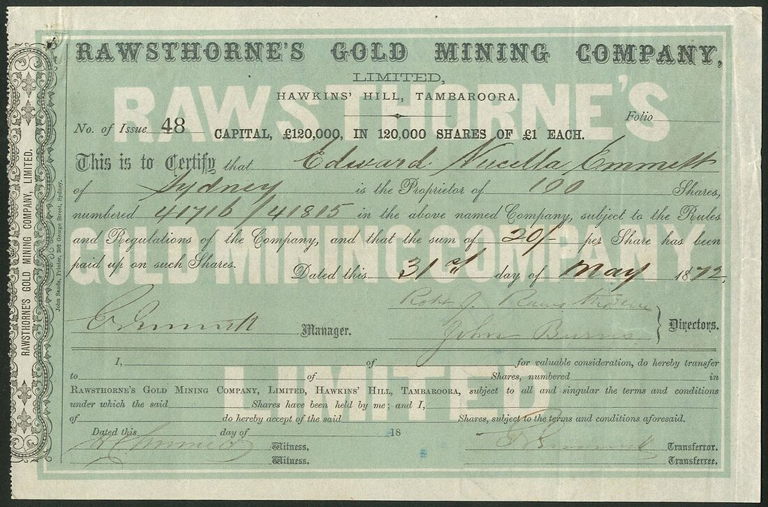 Australia: Rawsthorne's Gold Mining Co. Ltd., £1 shares, 18[72], #48, black text with green underprint. Registered in NSW. Mines at Hawkin's Hill, Tambaroora, New South Wales. VF.