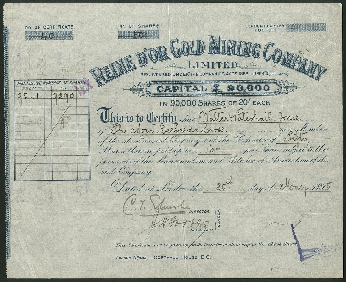 Australia: Reine d'Or Gold Mining Co. Ltd., certificate for 20/- shares, 189[5], #40, blue printing. Registered in Queensland in May 1895 to acquire 20 acre property on the Croydon Goldfield, Queensland. VF.