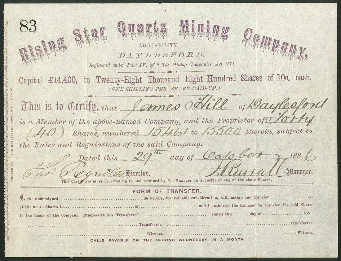 Australia: Rising Star Quartz Mining Co. NL., 10/- shares, part paid, 188[6], #83, mauve printing. Registered in Daylesford, Victoria. GVF.
