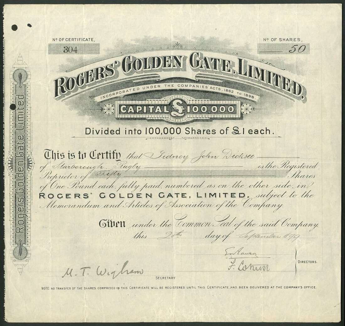 Australia: Rogers' Golden Gate Ltd., £1 shares, [1899], #304, black printing. Queensland. Filing holes top left, VF.