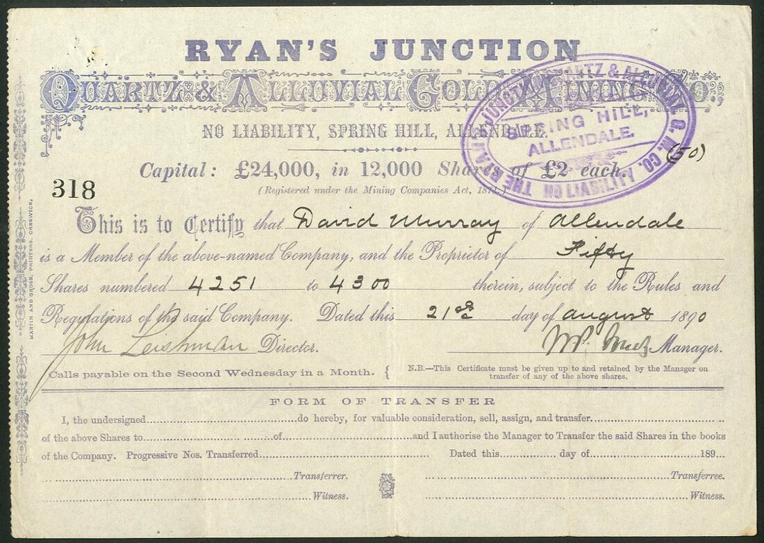 Australia: Ryan's Junction Quartz and Alluvial Gold Mining Co. NL., £2 shares, 189[0], #318, blue printing. Spring Hill, Allendale, Victoria. Pinholes, VF.