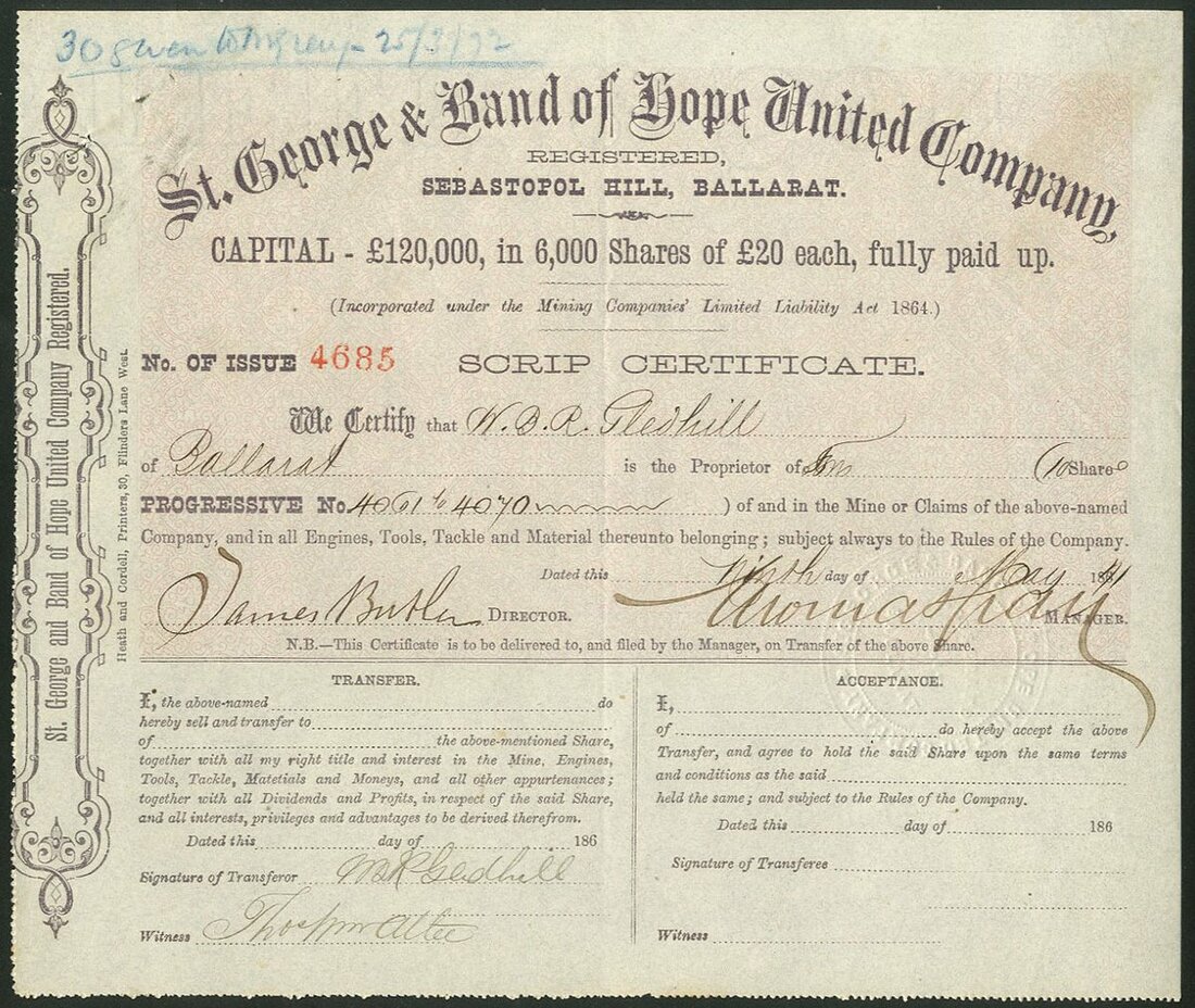 Australia: St. George & Band of Hope United Co. Reg., scrip for £20 shares, 186[71], #4685, mauve with pink underprint. Mines at Sebastopol Hill, Ballarat. VF.
