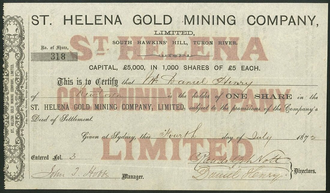 Australia: St. Helena Gold Mining Co. Ltd., £5 shares, 187[2], #318, black with pink underprint. Registered in NSW. Mines at South Hawkins' Hill, Turon River. GVF.