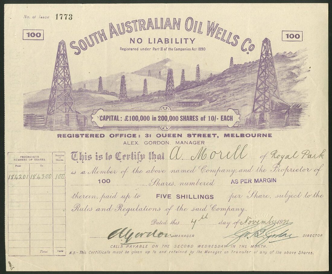 Australia: South Australian Oil Wells Co. NL., 100 shares of 10/- each, 19[21], #1773, large vignette of oilfield across top, mauve. Registered in Melbourne, Operations in Gippsland, Victoria. VF.