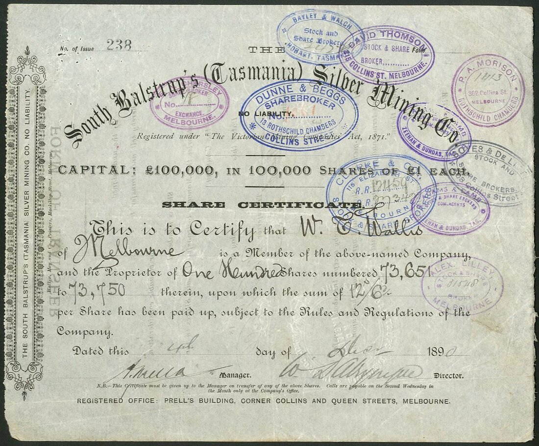 Australia: South Balstrup's (Tasmania) Silver Mining Co. NL., £1 shares, 189[0], #238, black printing, numerous stamps on face. VF.