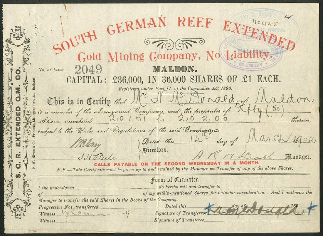 Australia: South German Reef Extended Gold Mining Co., NL., £1 shares, 18[1902], #2049, red and black. Registered in Victoria, Mines at Maldon. VF.