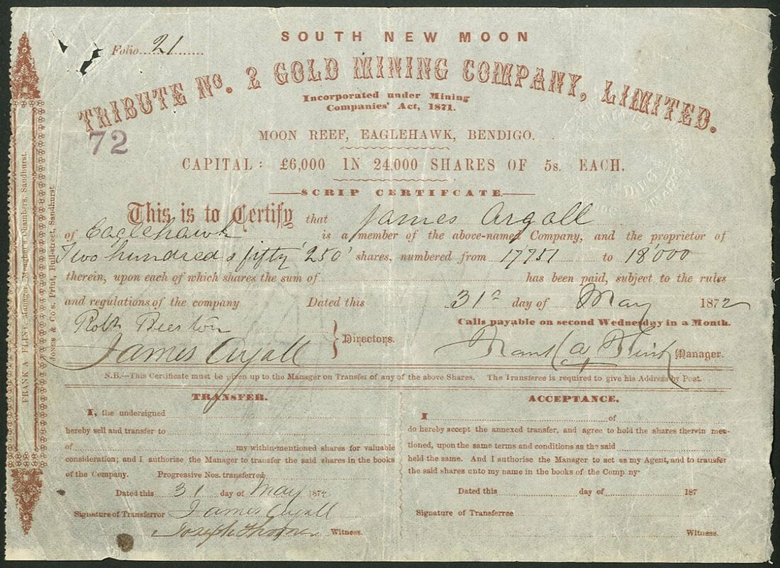 Australia: South New Moon Tribute No.2 Gold Mining Co. Ltd., scrip for 5/- shares, 187[2], #21, brown. Mines at Moon Reef, Eaglehawk, Bendigo. Spike hole top left, VF.