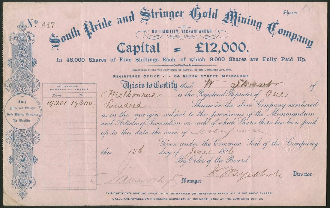 Australia: South Pride and Stringer Gold Mining Co., NL., 5/- shares, 189[6], #447, blue printing on pink paper. Mines at Yackandandah. GVF.