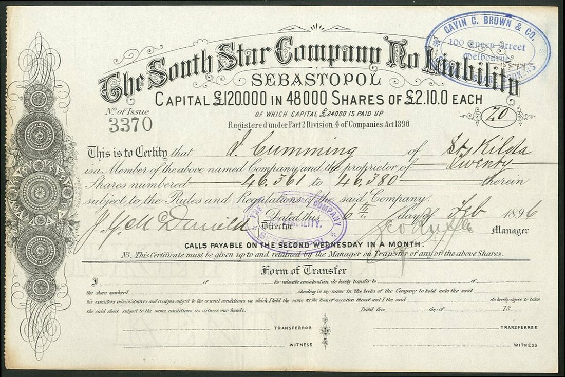Australia: South Star Company, NL., shares of £2.10.0 each, 189[6], #3370, black with scrollwork. Mines at Sebastopol, Ballarat, Victoria. VF.