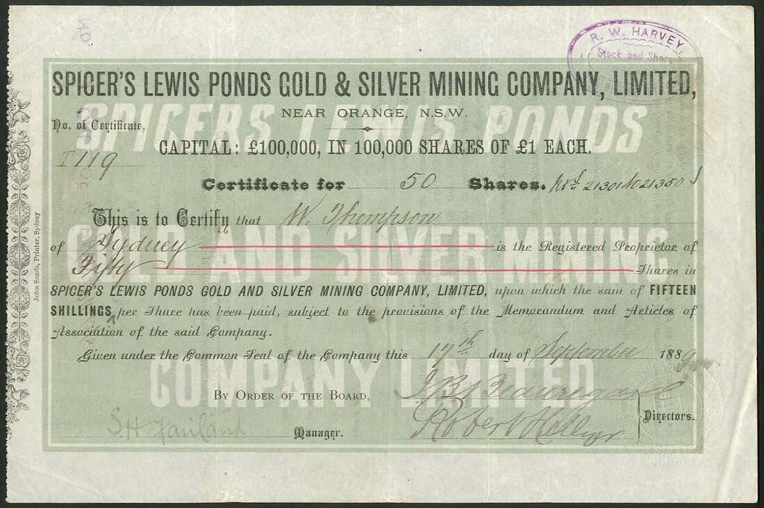 Australia: Spicer's Lewis Ponds Gold & Silver Mining Co. Ltd., Near Orange, New South Wales, £1 shares, 188[9], #119, 15/- paid, black, green underprint, printed in Sydney. VF.