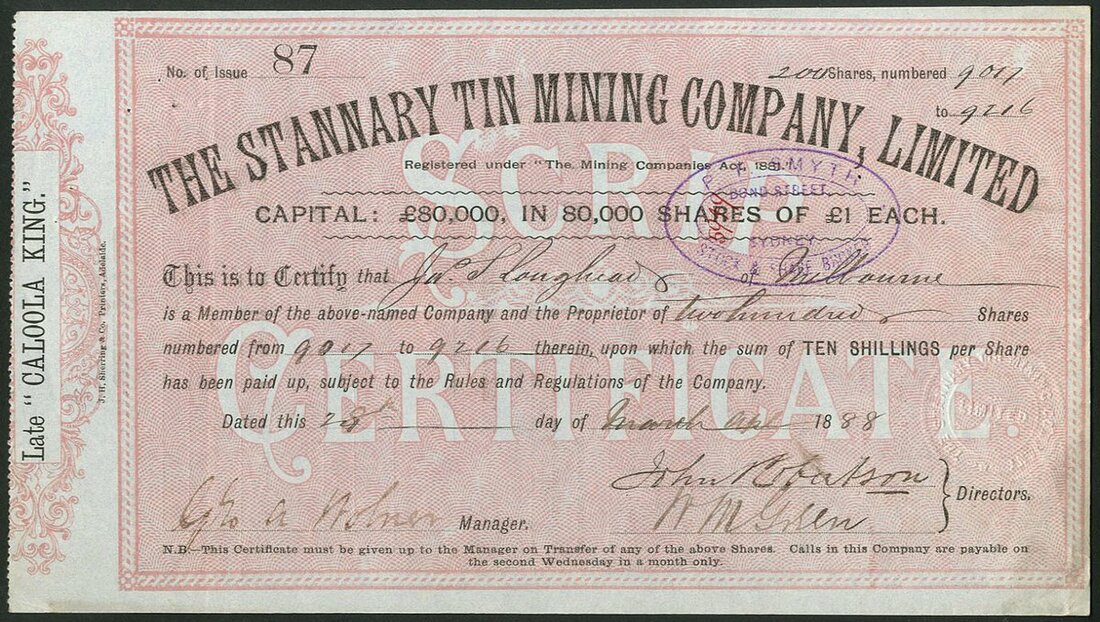 Australia: Stannary Tin Mining Co. Ltd., £1 shares, 18[88], #87, black with pink underprint, 'late Caloola King' printed at left. VF.