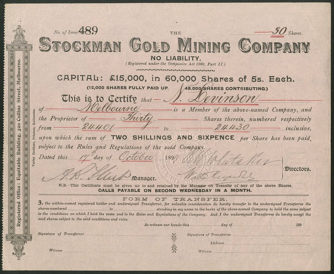 Australia: Stockman Gold Mining Co., NL., 5/- shares, 189[9], #489, black on pale pink paper. Mining in the Big River area. GVF.