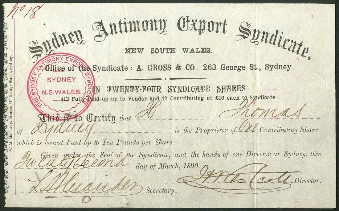 Australia: Sydney Antimony Export Syndicate, one contributing share of only 12 issued, 1890, #18, black, red seal on face. Operating in New South Wales. VF.