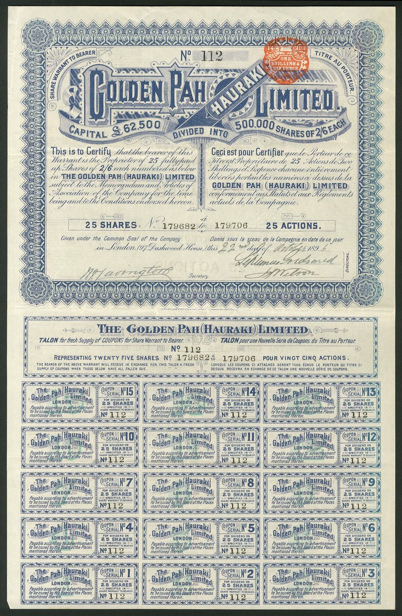 New Zealand: Golden Pah (Hauraki) Ltd., bearer warrant for 25 shares of 2/6d, 189[6], #112, signed by Septimus Goldsmid as director, ornate border, mauve, text in English and French, with coupons. Formed to acquire the Golden Pah mine from the Hauraki Company. GVF.